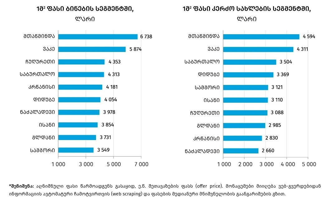 ამ პერიოდში, წინა კვარტალთან შედარებით, ფასები როგორც საცხოვრებელი ბინების სეგმენტში (1.3%), ისე კერძო სახლების სეგმენტში (2.1%) გაიზარდა. 2024 წლის IV კვარტალთან შედარებით ფასების ზრდა დაფიქსირდა ორივე სეგმენტში – ბინებზე 3.5%-ით, ხოლო კერძო სახლებზე 2.5%-ით.