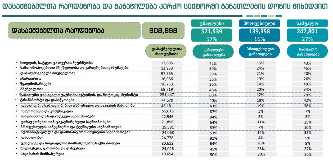 “დასაქმების სტრუქტურაში შეინიშნება უმაღლესი განათლების მქონე პირების სიჭარბე, მათ შორის ისეთ სექტორებში, როგორიცაა: ვაჭრობა, ადმინისტრაციული და დამხმარე მომსახურების საქმიანობები, განთავსების საშუალებების უზრუნველყოფის და საკვების მიწოდების საქმიანობები (სადაც ჩვეულებრივ, პროფესიული და ზოგადი განათლება უნდა იყოს დომინანტი)”,- აღნიშნულია ეკონომიკის სამინისტროს მიერ გამოქვეყნებულ ანალიზში.