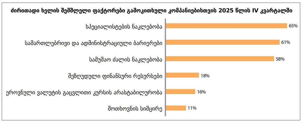 2025 წლის IV კვარტალში, ბიზნესსაქმიანობისთვის ყველაზე მნიშვნელოვანი ხელის შემშლელი ხუთი ფაქტორია: სპეციალისტების ნაკლებობა, სამართლებრივი და ადმინისტრაციული ბარიერები, სამუშაო ძალის ნაკლებობა, შეზღუდული ფინანსური რესურსები ეროვნული ვალუტის გაცვლითი კურსის არას ტაბილურობა.