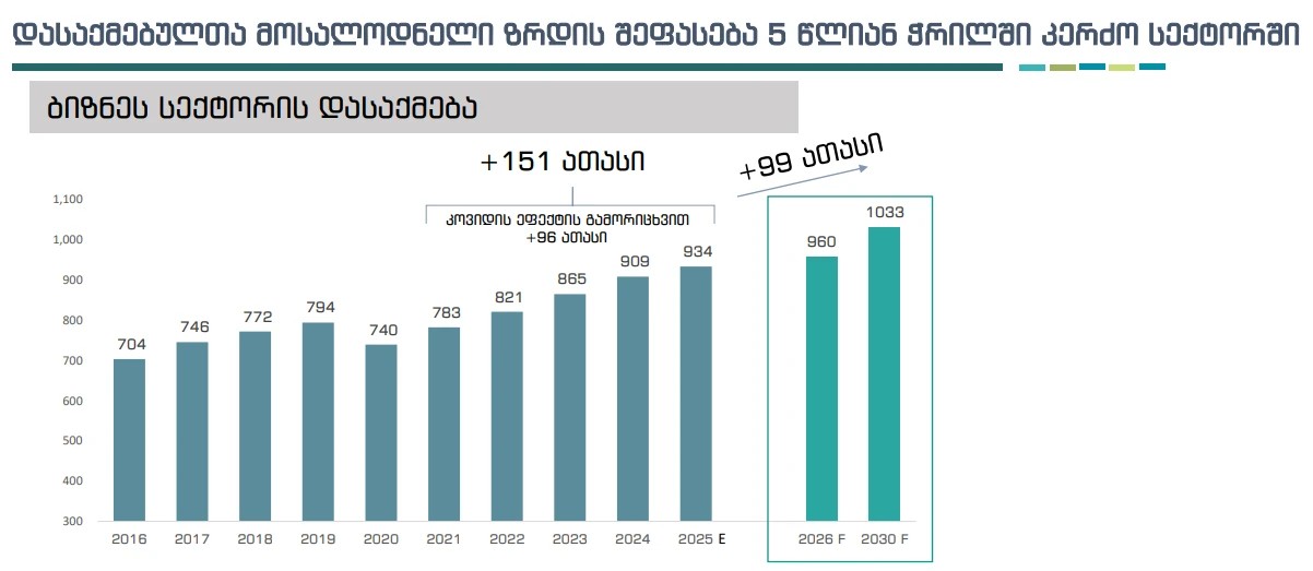 შესაბამისად, პროგნოზია, რომ კერძო სექტორში დასაქმებულთა რაოდენობა მიმდინარე წელს 960 ათასამდე გაიზრდება, ხოლო 2030 წლისთვის 1 მილიონს გადააჭარბებს.